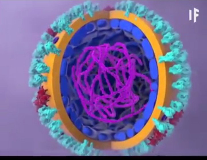 Next, the virus travels inside a sack made from your cell membrane to your cell’s nucleus that where your cell houses all it genetic material. Then, the viral envelope and cell membrane sack combines, allowing the the viral envelope and cell membrane sack combines, allowing the viral genetic material to leave the sack and enter the nucleus. The viral genetic material hijacks the energy and materials in your cell’s nucleus to make thousand of copies of itself. Some of the genetic material moves out of the nucleus, then attaches to the protein building parts of your cell called ribosomes. These then use information from the genetic material to make other viral proteins, such as spike protein. A packaging structure in your cell then carries the spikes in vesicles, which merge with your cell’s outer layer, the cell membrane. All the parts needed to create a new virus gather just beneath your cell’s membrane. Then, a new virus begins to butt off from the cell’s membrane.